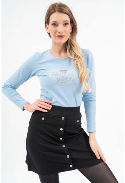 női szoknya rugalmas anyagbólA vonalú rövid fazonfémcímkével díszítve