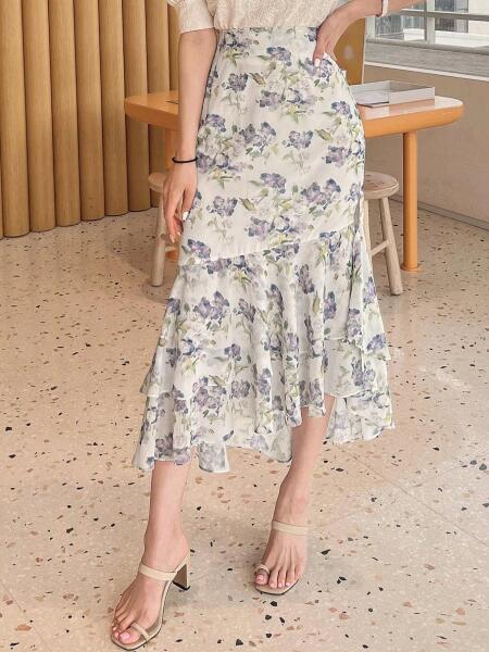Dazy KC11202 Dazy Aszimmetrikus Szoknya Virágmintás Fodros Magas Derekú (17) L