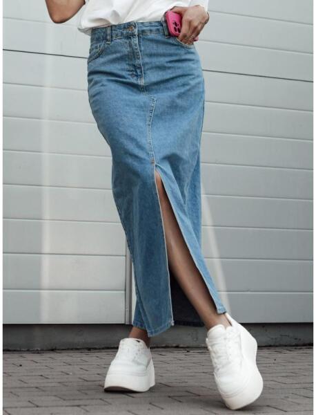 Női farmer maxi szoknya kék színben, hasítékkal, kiváló minőségű anyagból, a legújabb divattrendek szerint tervezve.