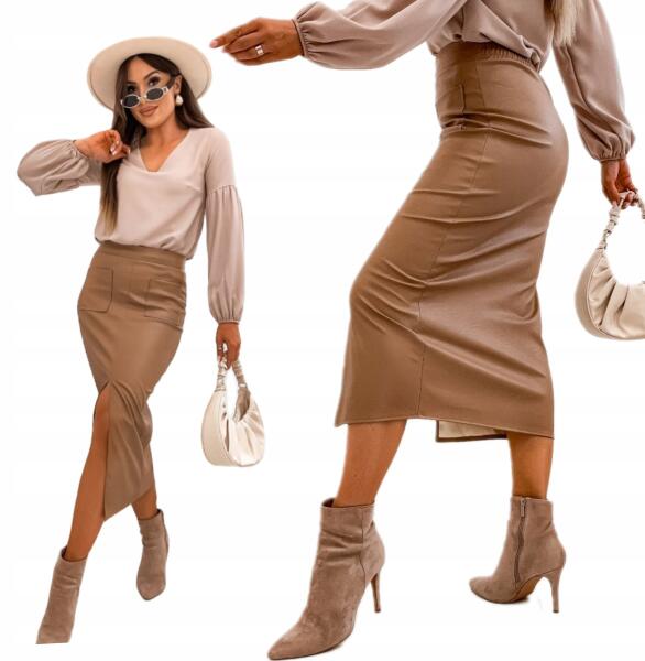 Elegáns Ceruzaszoknya MIDI Öko Bőrből, Prémium Camel Kivágással, SALLEGRO