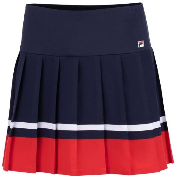 Sokoldalú Fila SABINE rakott szoknya. A klasszikus Fila színek csíkok formájában vannak jelen. A sportos designt magas derékrész egészíti ki, belső zsinórral. A szoknyát egy kis F-Box logó egészíti ki a derékrész bal oldalán és integrált rövidnadrággal is ellátták. Alkalmas olyan sportokhoz, mint a tenisz, a golf és az evezés.