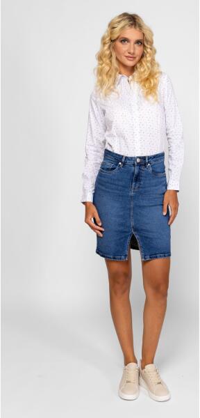Női farmerszoknya, klasszikus kidolgzással, térd feletti hosszal, 5 zsebbel, cipzáros záródással, övtartókkal, egyenes szabással, elején hasítékkal, elasztánnal kevert pamut anyagból. Anyaga: 83% pamut, 15% poliészter, 2% elasztán, farmer. A modell 175 cm magas és S-es méretet visel. Az öv nem tartozéka a szoknyának.