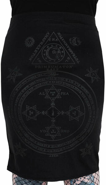 Női enyhén rugalmas szoknya nyomtatással. A derék is rugalmas. Összetétel: 82% nejlon, 18% elasztán. Fekete szín. Márka: KILLSTAR.