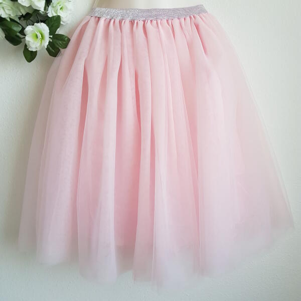 Csillogó derekú, rózsaszín tüll midi szoknya esküvőre, koszorúslányoknak ? Ez a bájos, 5 rétegű tüllszoknya tökéletes választás koszorúslányoknak, menyasszonyoknak, vagy akár egy különleges alkalomra is! A 60-as évek stílusát idéző, bő szabású szoknya önállóan is viselhető, de alsószoknyaként is remekül funkcionál, gyönyörű tartást adva a ruhádnak. Főbb jellemzők: ✨ Csillogó ezüstszálas gumis derékpánt: Kényelmes viseletet biztosít (80-100 cm derékbőségig). ? 5 réteg finom tüll: Lenyűgöző megjelenést kölcsönöz. ? Midi hossz: Kb. 60 cm + 3 cm a gumi magassága. ? Sokoldalú felhasználás: Viselhető koszorúslány ruhaként, alsószoknyaként, vagy akár egyedi alkalmi ruhaként is. ? Saját készítés: Egyedi méretre és színre is elkészíthető! További előnyök:Kényelmes viselet: A gumis derékpántnak köszönhetően egész nap kényelmesen viselhető. Egyedi megjelenés: A csillogó derékpánt és a rózsaszín tüll különleges és elegáns megjelenést biztosít. Tartás: Alsószoknyaként használva gyönyörű tartást ad a ruháknak. Rugalmas: Egyedi igényekre szabható, így biztosan megtalálod a tökéletes méretet és színt. Ne habozz, rendeld meg most ezt a gyönyörű tüllszoknyát, és varázsold még emlékezetesebbé a nagy napot! ?