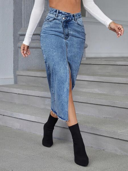 Shein LC35219 Shein Aszimmetrikus Farmer Szoknya Magas Derekú Slicc Xs