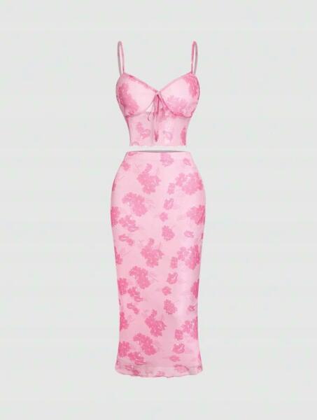 Shein Rózsaszín Virágos Felső Szoknya (xs) (584903)